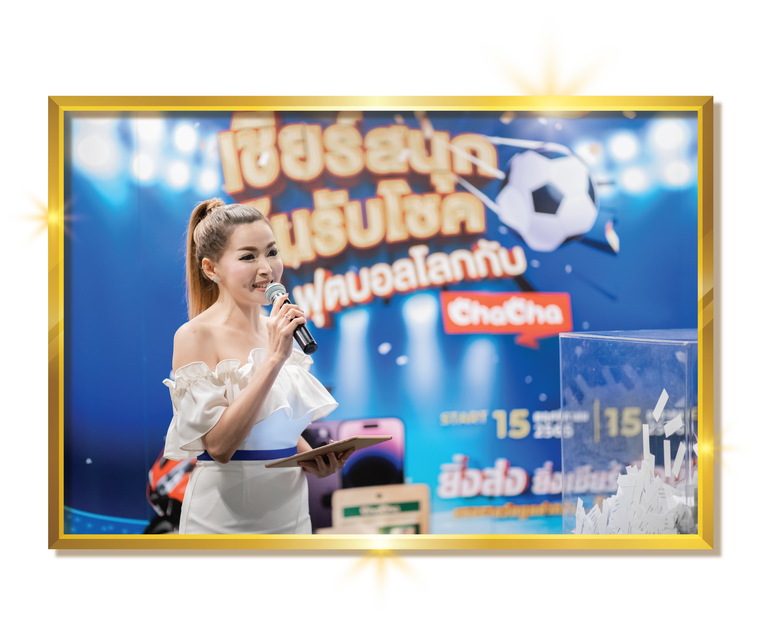 พิธีจับรางวัลกับแคมเปญชิงโชคสุดมันอย่างฟุตบอลโลก ที่งานนี้ชาช่าจัดหนัก แจกเต็มให้กับคอบอล และลูกค้าของชาช่า ให้เพลินเพลินกับการรับชมฟุตบอลโลก ไปพร้อมกับลุ้นชิงรางวัลมากมาย โดยทีมงานของทางกู๊ด แอตติจูด ได้รังสรรพิธีจับรางวัลอย่างอย่างยิ่งใหญ่ โดยในงานนี้้มีการแจกรางวัลน่าสนใจมากมาย อาทิ รถจักรยานยนต์ ยามาฮ่าแอร็อคซ์, iPhone 14 Pro 128 GB,และสร้อยคอทองคำหนัก ๒ สลึง รวมมูลค่าทั้งสิ้นกว่า 9 แสนบาท โดยทีมงานมีการผลิต Backdrop โดยออกแบบธีมฟุตบอลโลกเข้ากับกิจกรรม